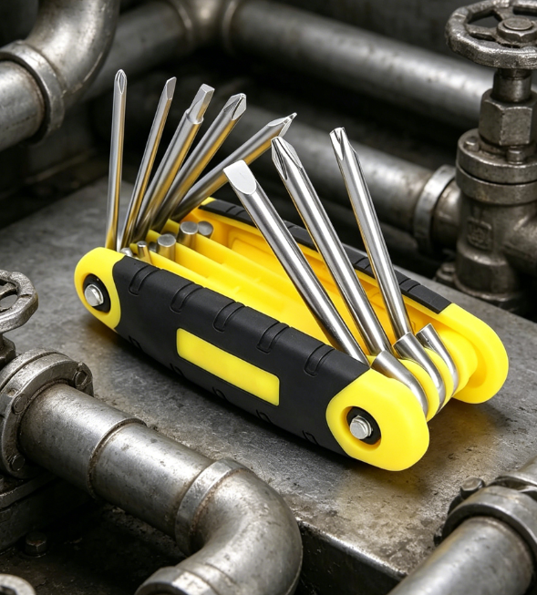 Includes 8 screwdriver heads in a folding design, covering common Phillips and slotted specifications