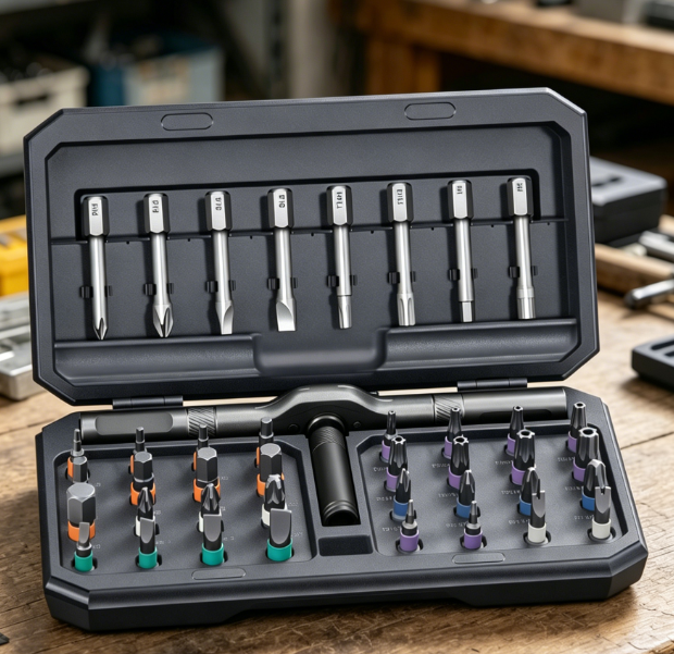 • Includes multiple bit types and ratchet handle system for improved torque control